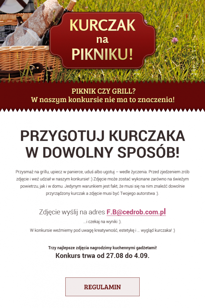 Aby wziąć udział w naszym konkursie, należy przygotować w dowolny sposób kurczaka na pikniku lub na grillu, a następnie uwiecznić go na fotografii i przesłać na adres e-mail: F.B@cedrob.com.pl. Trzy najlepsze propozycje obiadowe nagrodzimy kuchennymi gadżetami!