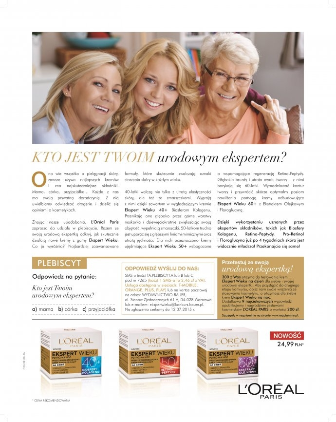 Odpowiedzi można wysyłać: SMS o treści PN.PLEBISCYT.A lub B lub C pod nr 7265, e-mail: ekspertwieku@konkurs.bauer.pl, lub na kartkach pocztowych na adres Wydawnictwo Bauer, Al. Stanów Zjednoczonych 61A, 04-028 Warszawa