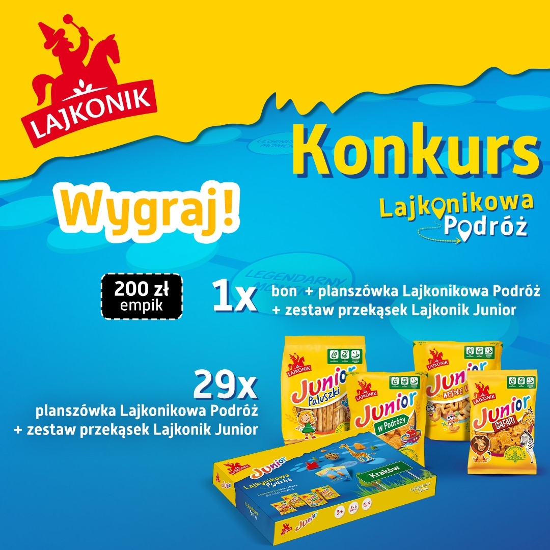 - 1x bon na 200zł do salonów sieci Empik + planszówka Lajkonikowa Podróż + zestaw przekąsek Lajkonik Junior