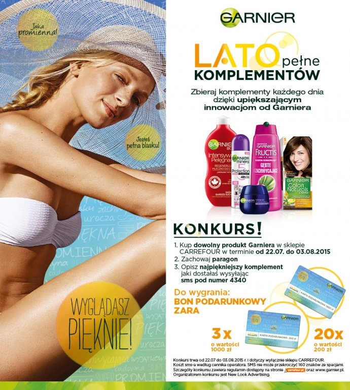 W dn. 22.07-03.08.2015 w sklepie Carrefour należy dokonać zakupu produktu Garnier i następnie odpowiedzieć na pytanie: "Jaki najpiękniejszy komplement w życiu dostałaś?" wysyłając SMS na nr 4340