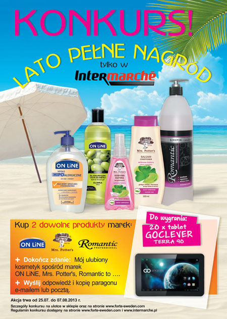 - drogą pocztową na adres: Forte Sweden Sp. z o.o., „KONKURS”, ul. Kościuszki 1, Rogierówko, 62-090 Rokietnica wraz z odpowiedzią na pytanie konkursowe: Mój ulubiony kosmetyk spośród marek ON LiNE, Mrs. Potter’s lub Romantic to…, danymi adresowymi i telefonem kontaktowym, kopią paragonu. Zgłoszenie może być dokonane na kuponie konkursowym z ulotki dostępnej w sklepach Intermarche lub na kartce z kopią paragonu.
