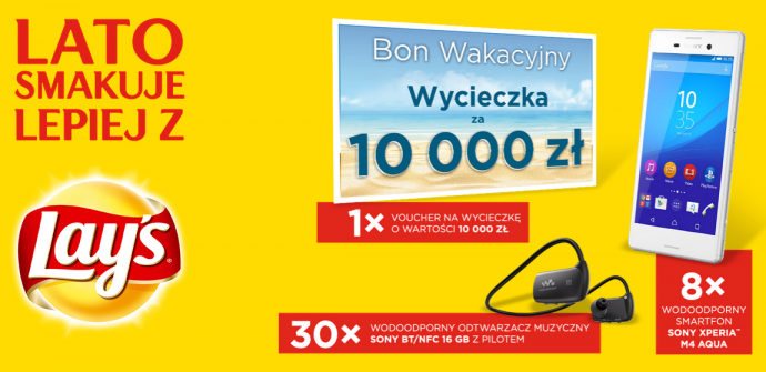 W dniach od 01.07.2015 roku do 30.07.2015 roku, dokonaj jednorazowego zakupu produktów Lay's za kwotę co najmniej 10 zł brutto w sklepie sieci Tesco biorącym udział w Konkursie.Zachowaj dowód zakupu.Zgłoś się do konkursu na www.konkurslays.pl,dokończ kreatywne dokończenie zdania „Lato smakuje lepiej z Lay’s……”. Każdego dnia konkursu do zdobycia cenne nagrody, zwycięzców wybiera komisja.