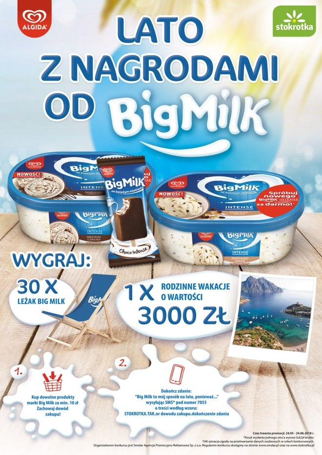 Aby wziąć udział w konkursie, należy kupić minimum jeden produkt Big Milk za minimum 10 zł, zachować dowód zakupu, a następnie wysłać pod numer 7055 SMS o treści według wzoru: STOKROTKA.TAK.nr dowodu zakupu.dokończenie zdania: