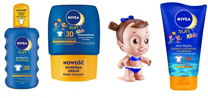 - Balsam ochronny na słońce NIVEA Sun Kids Swim & Play SPF 50+, Kieszonkowy balsam ochronny na słońce NIVEA Sun Kids SPF 30 i Nawilżający balsam ochronny na słońce NIVEA Sun Kids SPF 50+ stworzone specjalnie z myślą o delikatnej skórze dziecka, pomagają zapewnić natychmiastową ochronę. Zawierają system filtrów UVA/UVB oraz innowacyjną formułę ochrony ubrań przed plamami.