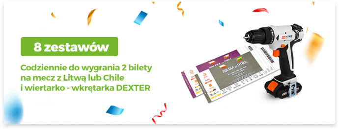 - 5 zestawów nagród, w skład każdego wchodzi: podwójny bilet na mecz towarzyski reprezentacji Polski odbywający się w dniu 8.06.2018 roku w Poznaniu oraz wiertarka, łączna wartość jednego zestawu wynosi: 568,00 zł brutto