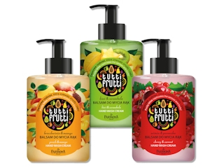 zestaw balsamów do mycia rąk Farmona TUTTI FRUTTI, o zapachach: Wiśnia & Porzeczka, Brzoskwinia & Mango oraz Kiwi & Karambola.