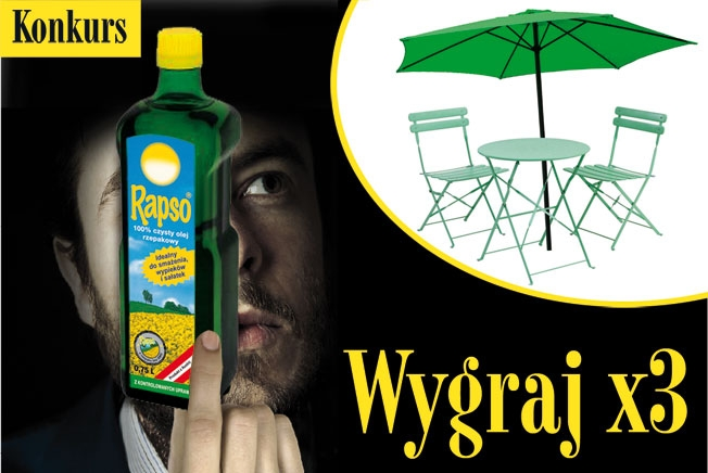 I - III miejsce: stolik balkonowy z dwoma krzesłami i parasolem przeciwsłonecznym oraz 4 butelkami oleju Rapso