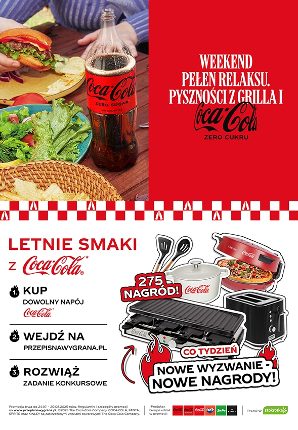 W terminie od 27.07-20.08.2025 kup produkt Coca-Cola w Stokrotce, rozwiąż zadanie i wygraj nagrodę.