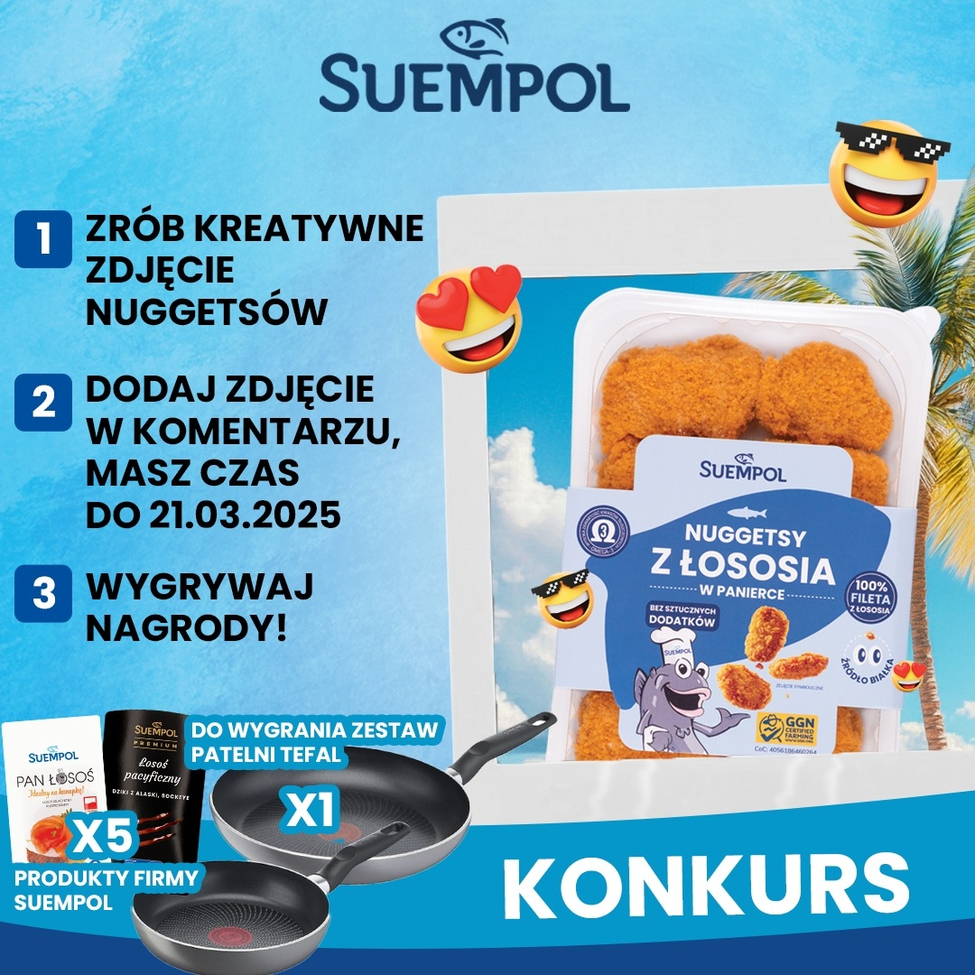 Zrób kreatywne zdjęcie nuggetsów z łososia w panierce Suempol w niebanalnej scenerii! Może to być elegancka kompozycja na talerzu lub szalony kadr w plenerze – ważne, by nasz produkt grał główną rolę.