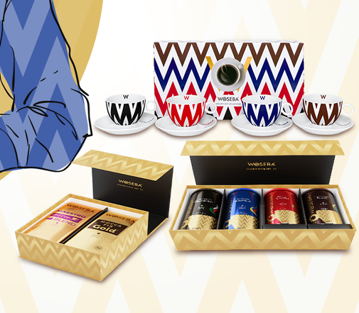 - 10x zestaw kaw ziarnistych i mielonych Woseba oraz komplet eleganckich filiżanek