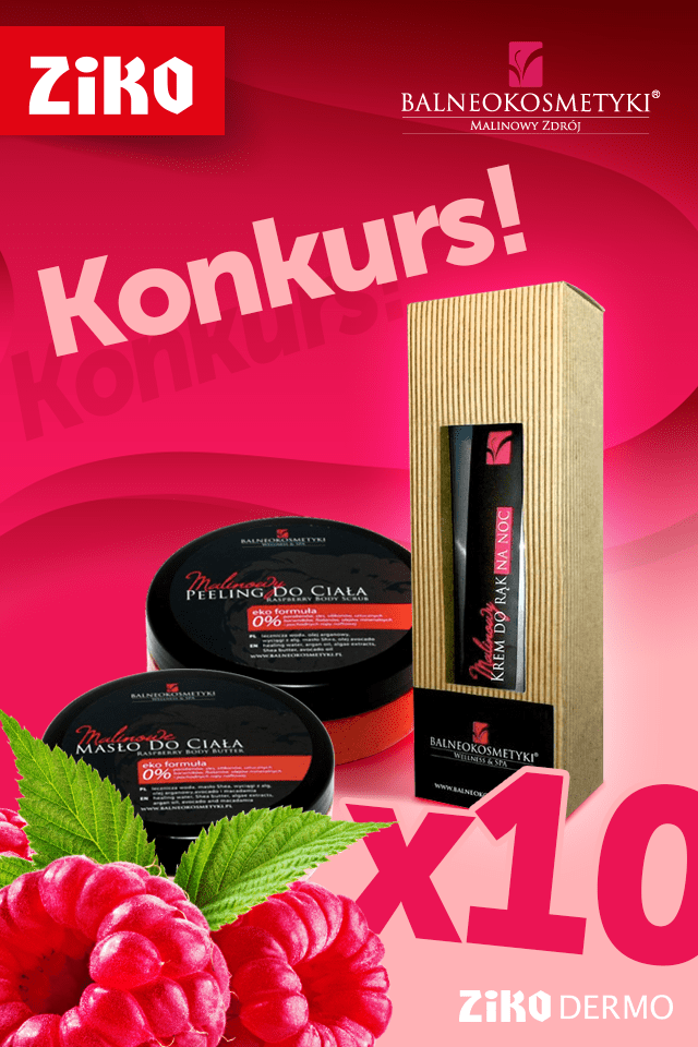 10x zestawów BALNEOKOSMETYKI „Malinowa Eko Pielęgnacja” składających się z: Malinowy Peeling do ciała 200 ml, Malinowe Masło do ciała 230 ml, Malinowy Krem do rąk na noc 70 ml