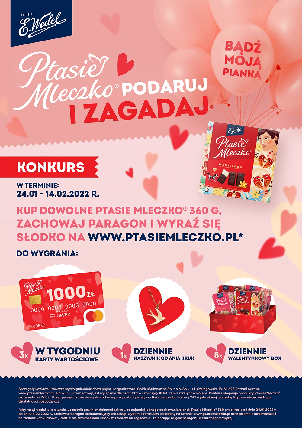Uczestnicy zobowiązani są do zakupu minimum jednego opakowania pianek Ptasie Mleczko® 360 g o dowolnym smaku, zarejestrowania się na stronie: ptasiemleczko.pl, uzupełnienia zadania konkursowego, które brzmi: „Podziel się swoim lekkim i słodkim tekstem na zagadanie” oraz dołączenia do niego zdjęcia paragonu, potwierdzającego zakup dowolnego opakowania pianek Ptasie Mleczko®.