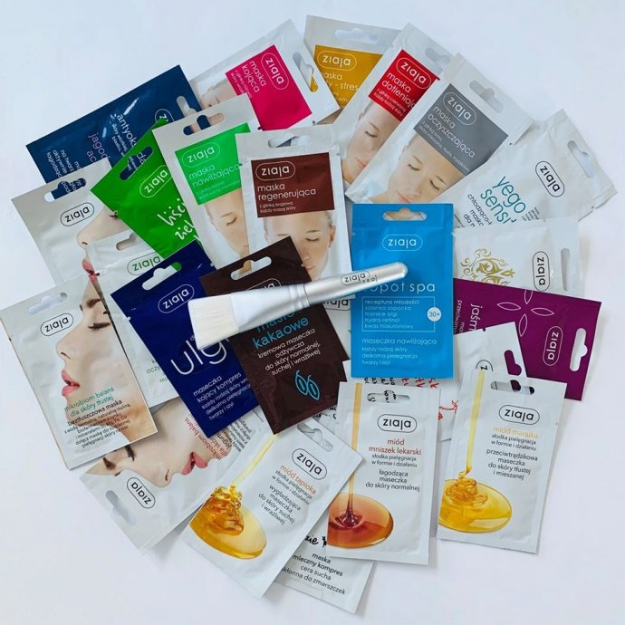 5 x 24 saszetki z różnymi maseczkami oraz pędzel Ziaja Pro do ich nakładania