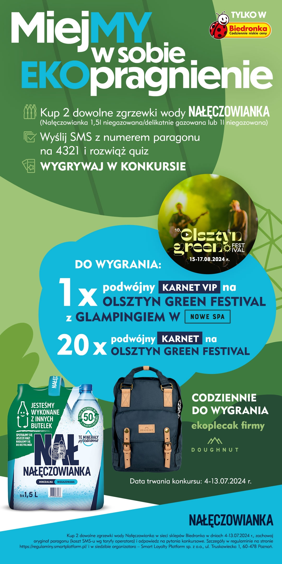 - Odpowiedz na ostatnie pytanie: Dlaczego chcesz wziąć udział w Olsztyn Green Festival? Wyślij odpowiedzi wg wzoru: NAL.Twoja odpowiedź, np. NAL. Chcę wziąć udział w OGF, ponieważ łączy on moją pasję do muzyki z troską o środowisko, oferując unikalne doświadczenia w pięknej, naturalnej scenerii.