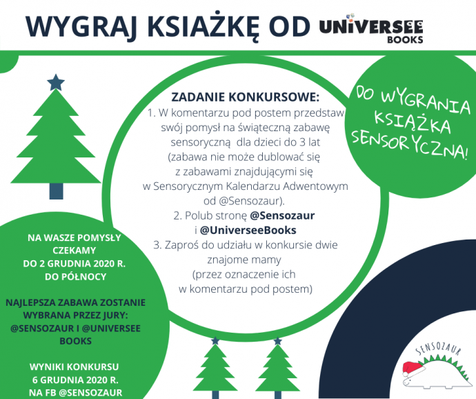 - Przedstawisz w komentarzu pod postem (na profilu @Sensozaur) swoją jedną propozycję świątecznej zabawy sensorycznej dla dzieci do 3 lat (zabawa nie może się dublować z zabawami znajdującymi się w Sensorycznym Kalendarzu Adwentowym od Sensozaur , w przypadku podania przez jedną osobę więcej niż jednej zabawy, w konkursie bierzemy pod uwagę pierwszą zabawę .