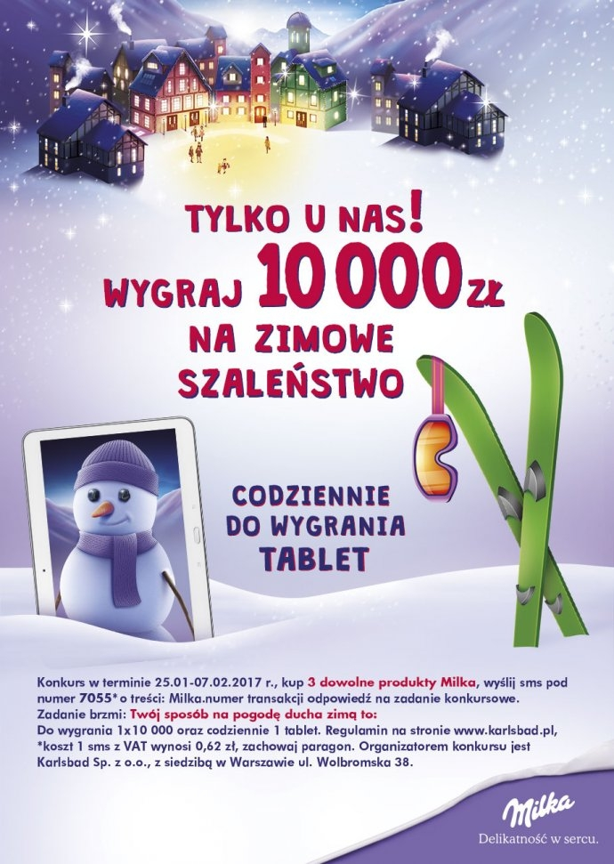 Kup w Żabce trzy dowolne produkty Milka (spis produktów promocyjnych w regulaminie, wykonaj zadanie konkursowe polegające na odpowiedzi na pytanie: Twój sposób na pogodę ducha zimą : według wzoru: MILKA.numer systemowy.odpowiedź