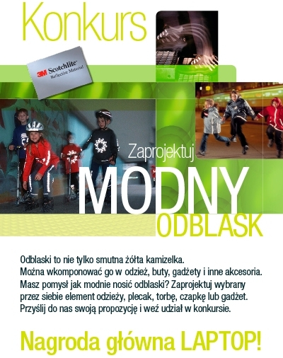 28 stycznia 2015 roku ruszył konkurs na projekt odblasków "MODNY ODBLASK"! Do wygrania jest 179 nagród, w tym super laptop, za projekt rzeczy z użyciem odblasku.