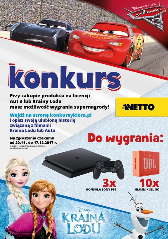 Należy zakupić w sieci Sklepów Netto dowolny produkt na licencji Disney - Auta 3 lub Kraina Lodu, opisać swoją ulubioną historię związaną z filmami Auta lub Kraina Lodu.