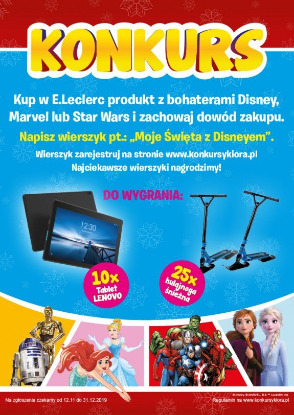 W okresie od dnia 12.11.2019 roku do dnia 31.12.2019 roku w jednym ze sklepów E.Leclerc, należy zakupić dowolny produkt z bohaterami Disney, Marvel lub Star Wars i wykonać pracę konkursową polegającą na napisaniu wierszyka pt.: „Moje Święta z Disneyem”.