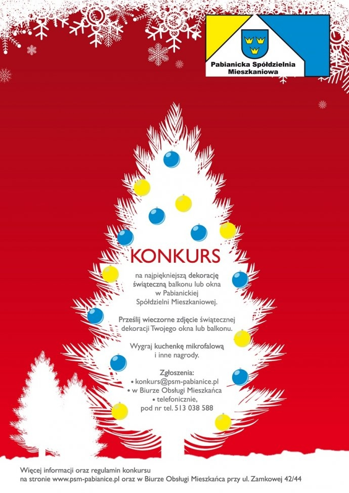 Konkurs na najpiękniejszą dekorację świąteczną balkonu lub okna w Pabianickiej Spółdzielni Mieszkaniowej.