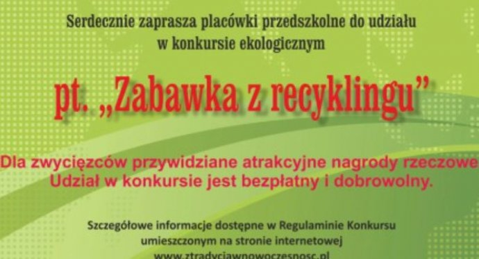 Lokalna Grupa Działania Stowarzyszenie „Z Tradycją w Nowoczesność” serdecznie zaprasza do udziału w konkursie ekologicznym pt. „Zabawka z recyklingu” placówki przedszkolne zlokalizowane na terenie Gmin i Miast wchodzących w skład Lokalnej Grupy Działania (LGD) Stowarzyszenia „Z Tradycją w Nowoczesność” tj.: Chłopice, Kańczuga, Laszki, Pawłosiów, Pruchnik, Radymno, Roźwienica oraz Miasto Radymno.