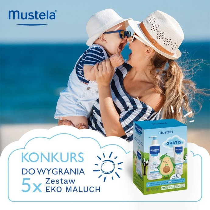 Konkurs polega na zamieszczeniu przez fanów profilu Mustela Polska zdjęcia maluszków z letnich przygód i wycieczek. Nagrodzonych zostanie 5 zgłoszeń. Nagrodą są zestawy: Eko Maluch dla skóry normalnej - Delikatny żel do mycia 500 ml i Hydra Bebe krem do twarzy 40 ml.