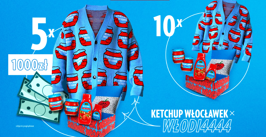- 10x box z ketchupami Włocławek (a w nim 4 ketchupy: Ketchup Włocławek Łagodny w słoiku 200g, Ketchup Włocławek Pikantny w słoiku 200g, Ketchup Włocławek Łagodny w butelce 480g, Ketchup Włocławek Pikantny w butelce 480g), puloverek zaprojektowany przez Włodi4444, łączna wartości każdej nagrody II stopnia to 320 zł