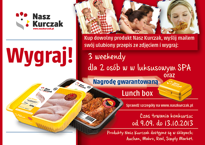 Należy dokonać zakupu dowolnego towaru oznaczonych logo Nasz Kurczak, a następnie przesłać przepis na danie z kurczaka inspirowane kuchnią polską wraz ze zdjęciem potrawy na adres konkurs@wipasz.pl