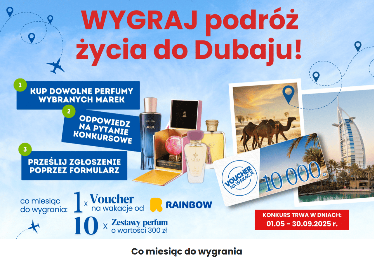 - 5 voucherów o wartości 10 000,00 zł każdy do wykorzystania na zakup wycieczki do Dubaju (imprezy turystycznej) w biurze podróży Rainbow