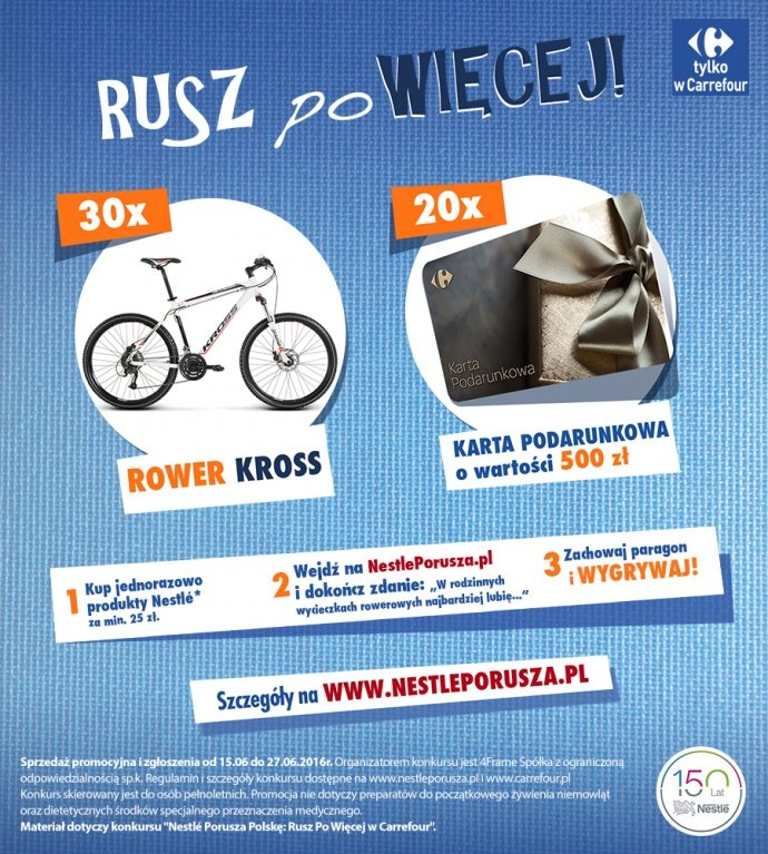 Kup w Carrefour produkty Nestle za minimum 25 zł., wejdź na www.nestleporusza.pl i dokończ zdanie: "W rodzinnych wycieczkach rowerowych najbardziej lubię..."