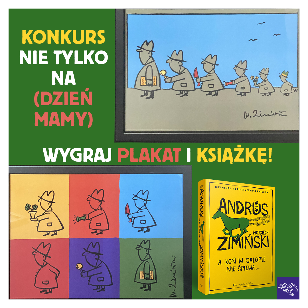 6x kolorowy zestaw prezentów: piękny plakat w ramce z rysunkiem i autografem Wojciecha Zimińskiego (1 z 2 dostępnych wzorów) oraz książką "A koń w galopie nie śpiewa" Artura Andrusa i Wojciecha Zimińskiego.