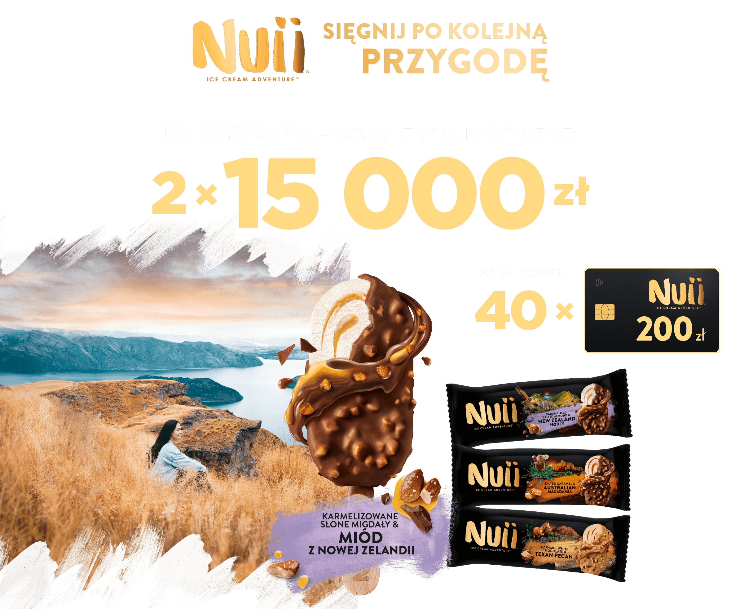 W dn. 01.07.-20.07.24r. w Biedronce należy dokonać zakupu min. trzech lodów Nuii 90 ml lub jednego mini Multipacka Nuii i na stronie konkursu udzielić odp. na pytanie: "Gdzie latem chciałbyś wyruszyć z Nuii i dlaczego?" (max 320 znaków)