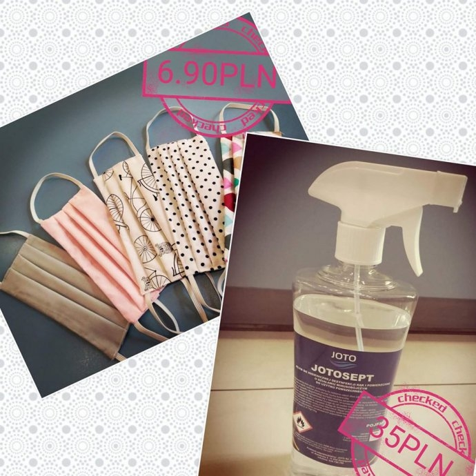 zestaw dwóch maseczek ochronnych wielokrotnego użytku oraz butelka płynu dezynfekującego o pojemności 0.75L.