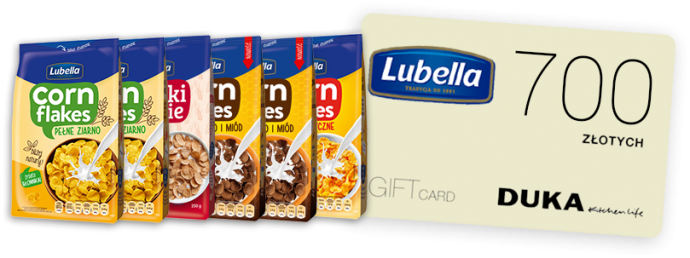 - Pięć bonów do sklepów DUKA o wartości 100zł oraz zestaw płatków Lubella Corn Flakes