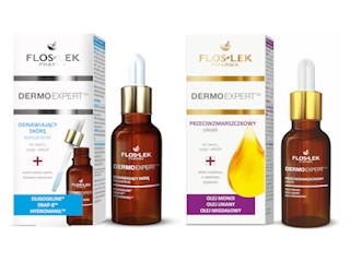 4 zestawy kosmetyków od FLOSLEK. W skład zestawu wchodzi koncentrat odnawiający i olejek przeciwzmarszczkowy z linii DERMO EXPERT
