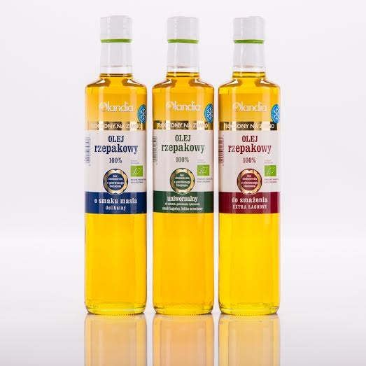 zestaw trzech olejów ekologicznych Olandia tłoczonych na zimno z zarodków rzepaku: olej uniwersalny, do smażenia i o smaku masła