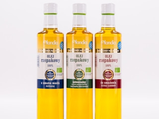 zestaw trzech olejów ekologicznych Olandia tłoczonych na zimno z zarodków rzepaku: olej uniwersalny, do smażenia i o smaku masła.