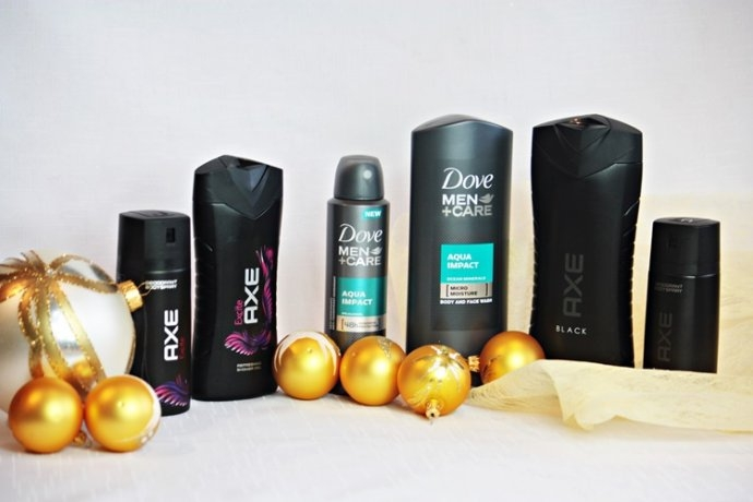 2 zestawy kosmetyków marki Axe oraz 1 marki Dove składające się z żelu pod prysznic oraz dezodorantu.