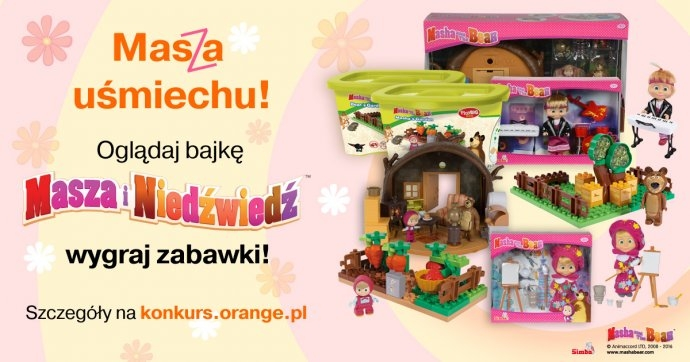 W okresie od 18.04 do 8.05 wypożycz minimum jeden odcinek bajki z serii „Masza i Niedźwiedź” lub „Bajeczki Maszy” z zakładki „Mas(z)a uśmiechu!”, dostępnej w usłudze Orange TV (dostępnej poprzez dekoder) lub w usłudze Telewizja Tu i Tam na orange.pl. Następnie odpowiedz na jedno pytanie: „Który bohater bajki „Masza i Niedźwiedź” wywołuje uśmiech na Twojej twarzy i dlaczego?”, na stronie konkurs.orange.pl