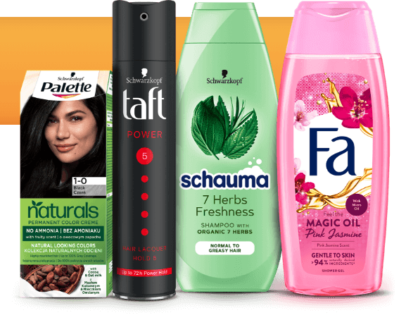 Dwa produkty z puli marek: Fa, Schauma, Palette lub Taft.