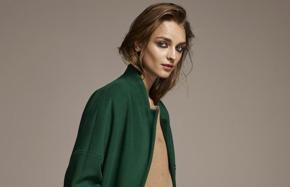 - Bluzka koszulowa w kolorze szmaragdowym z małą stójką, ukrytym zapięciem i długimi pęknięciami na przodzie, dzięki którym można swobodnie włożyć koszulę do spodni lub spódnicy