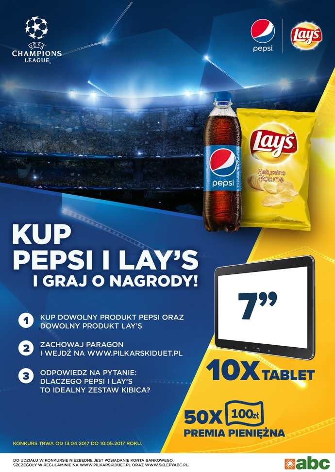 Kup w sklepie abc dowolny produkt Pepsi, oraz dowolny produkt Lay's i zachowaj paragon.Wypełnij formularz, odpowiedz na pytanie:"Dlaczego Pepsi i Lay's to idealny zestaw kibica?"