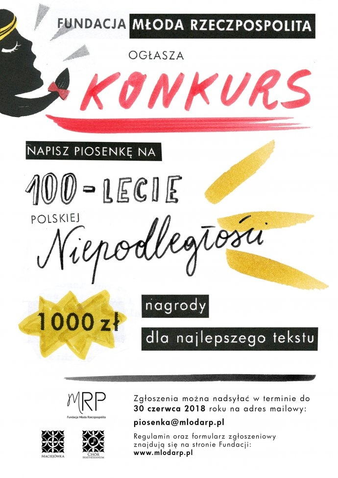 Fundacja Młoda Rzeczpospolita ogłasza konkurs na autorski tekst piosenki patriotycznej w ramach 100. rocznicy odzyskania przez Polskę Niepodległości.