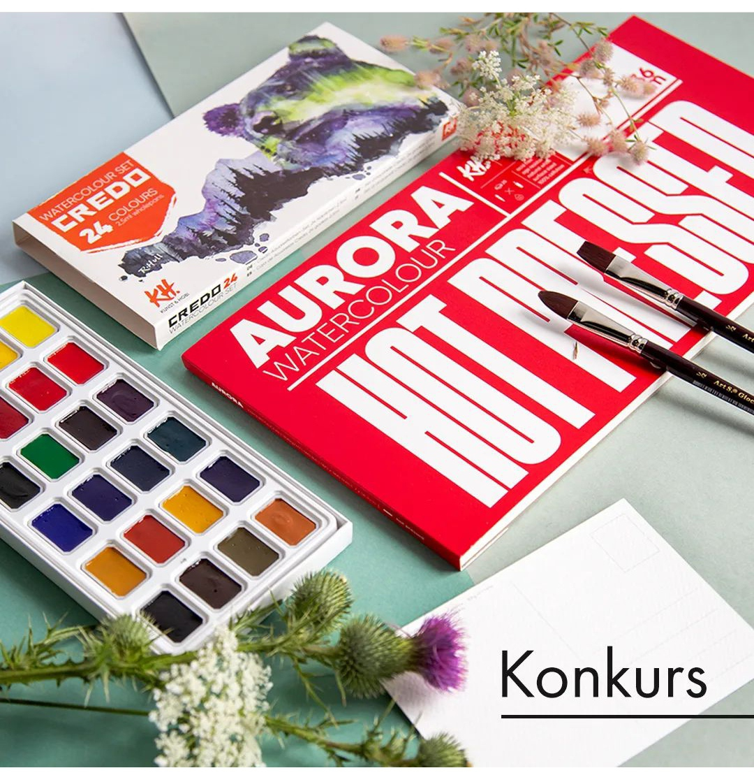 1x zestaw farb akwarelowych KUNST & HOBI, blok panoramiczny AURORA, dwa pędzle Art S. Giocionda.