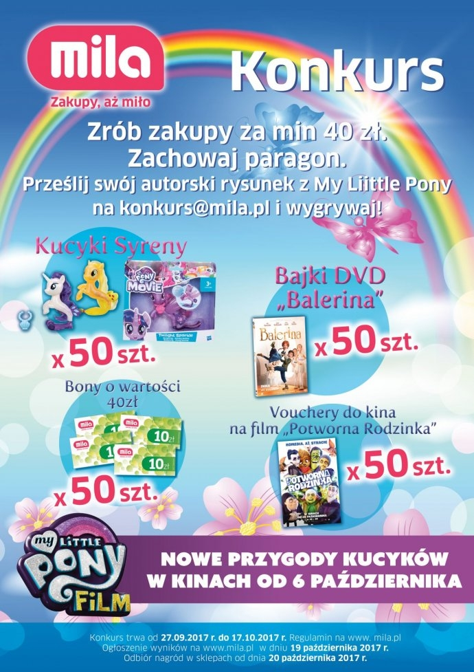 Zrób zakupy za minimum 40zł. Zachowaj paragon i prześlij swój autorski rysunek z My Little pony na konkurs@mila.pl