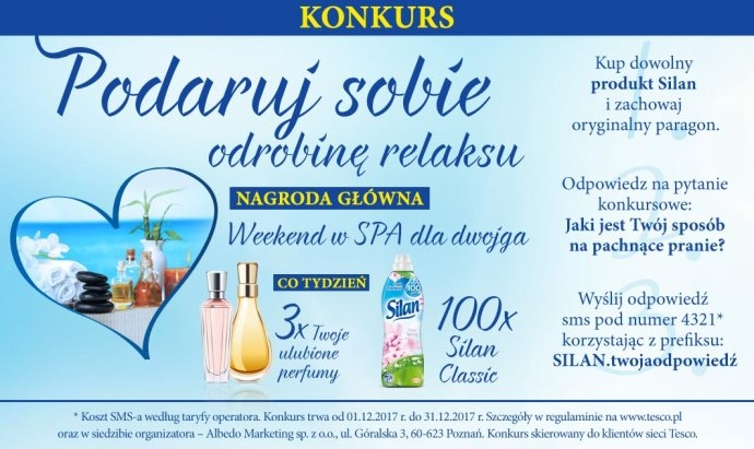 Należy kupić w dowolnym Sklepie Tesco jednorazowy produktu marki Silan i wysłać zgłoszenia udziału w Konkursie w formie SMS-a pod numer 4321 z odpowiedzią na pytani: