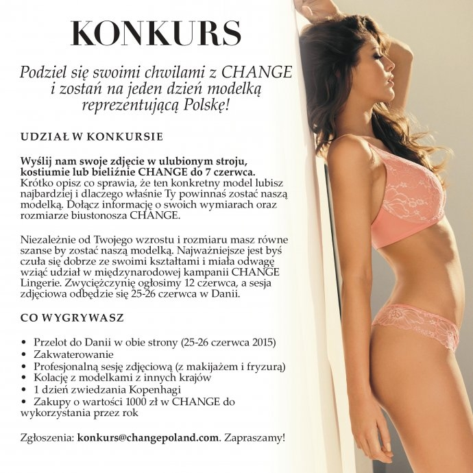 Niezależnie od Twojego wzrostu i rozmiaru masz równe szanse by zostać modelką. Najważniejsze jest byś czuła się dobrze ze swoimi kształtami i miała odwagę wziąć udział w międzynarodowej kampanii CHANGE Lingerie. Laureatkę poznamy 12 czerwca, a sesja zdjęciowa odbędzie się 25-26 czerwca w Danii.