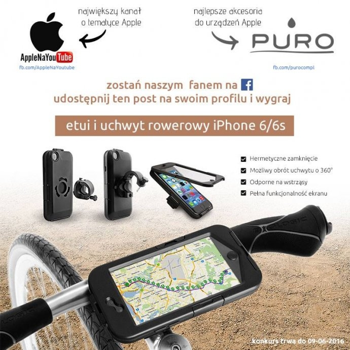 Ruszamy z prostym konkursem dla wszystkich aktywnych fanów Apple - do wygrania świetny uchwyt rowerowy z etui Puro dedykowany dla #iphone - wystarczy polubić profil PURO Polska i applenayoutube.pl oraz udostępnić ten post na swojej tablicy. Losowanie zwycięzcy, która spełni ww. warunki nastąpi 10-06-2016.