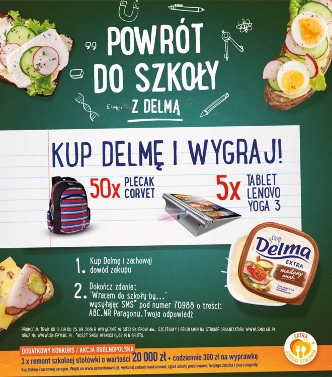 Należy kupić dowolny produkt marki Delma, swoją propozycję dokończenia zdanie "Wracam do szkoły, by..." wysyłać SMSem pod numer 70988, według wzoru: ABC.TAK.nr paragonu.Twoja odpowiedź.