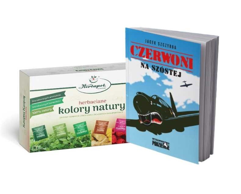 powieść historyczna Jacka Szczyrby "Czerwoni na szóstej" oraz zestaw herbat ziołowo-owocowych